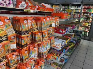 The shop sells lottery tickets, smoke-shop items, breakfast, coffee, and a wide variety of other merchandise; however, the current owner does not sell beer.