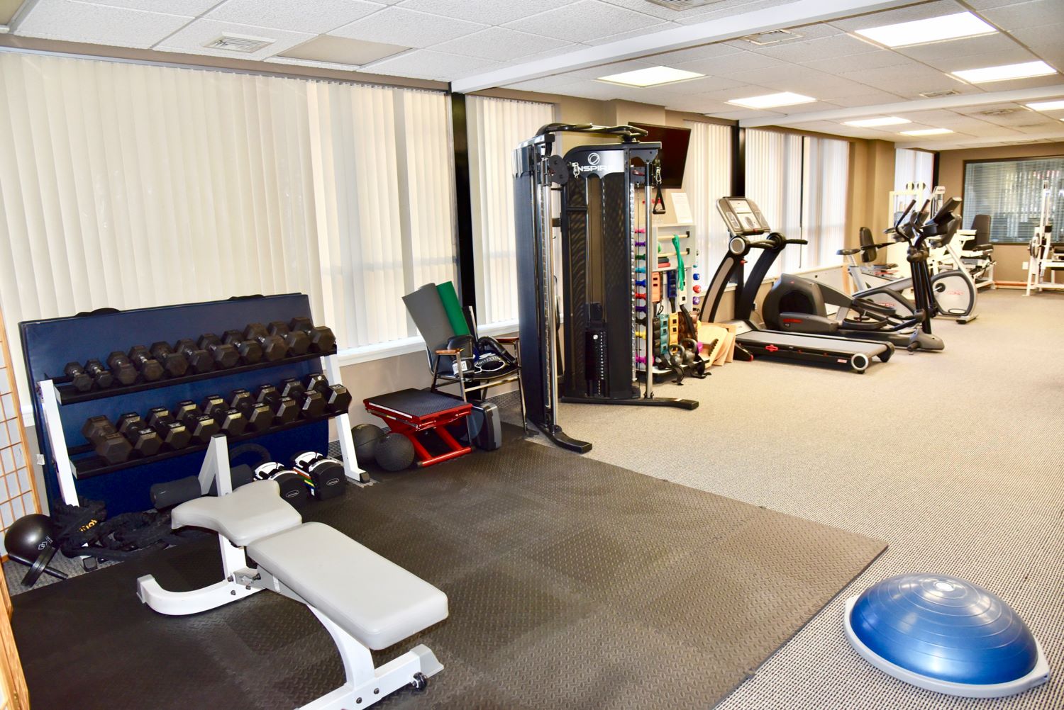 There are 5 treatment rooms a large physical therapy space, bathroom and kitchen.