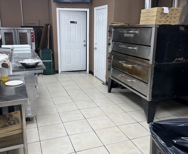 The pizzeria is fully equipped, with a functional kitchen, pizza ovens, and dining space ready for immediate operation.